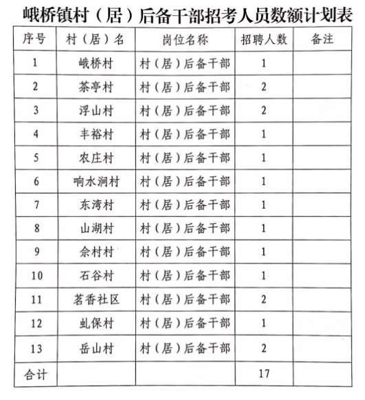 一、 招聘指标本次面向社会公开招聘村(居)后备干部17名,具体分配情况见附表。