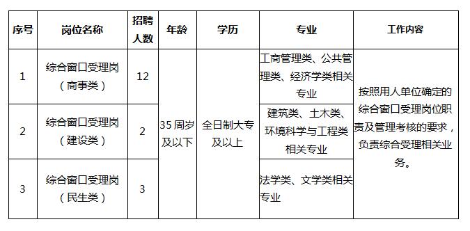一、招聘岗位:综合窗口受理岗招聘人数共17名,具体岗位要求如下: